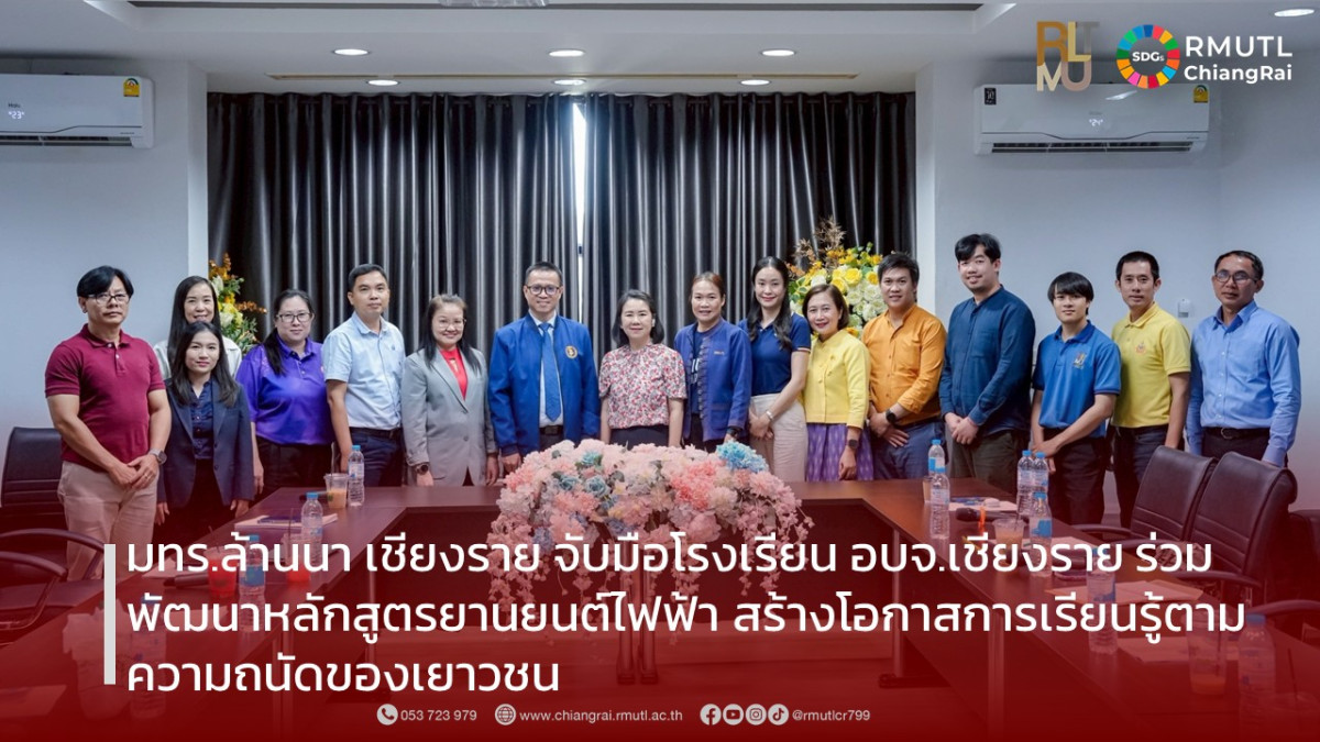 เมื่อวันที่ 9 ตุลาคม 2568 มหาวิทยาลัยเทคโนโลยีราชมงคลล้านนา เชียงราย นำโดย ผู้ช่วยศาสตราจารย์ ดร.ชไมพร รัตนเจริญชัย ผู้อำนวยการสำนักงานบริหาร, นางณัชชา ทิพย์ประเสริฐ ผู้อำนวยการกองการศึกษา พร้อมด้วยผู้บริหารและคณาจารย์ เข้าร่วมประชุมแลกเปลี่ยนเรียนรู้และวางแนวทางการจัดการเรียนการสอน โปรแกรมยานยนต์ไฟฟ้า (EV Program) ร่วมกับ โรงเรียนองค์การบริหารส่วนจังหวัดเชียงราย โดยมี นายกฤษฎา ใจหล้า ผู้อำนวยการโรงเรียนองค์การบริหารส่วนจังหวัดเชียงราย พร้อมด้วยคณะผู้บริหารและคณะครู ให้การต้อนรับ และร่วมกันหารือแนวทางการพัฒนาหลักสูตรเพื่อส่งเสริมให้นักเรียนได้เรียนรู้ในสิ่งที่ตนเองชอบและถนัด รวมถึงเตรียมความพร้อมสำหรับอาชีพในอนาคตที่สอดคล้องกับเทคโนโลยีสมัยใหม่