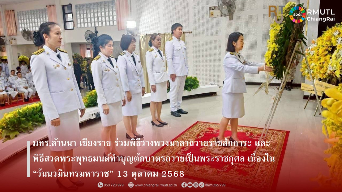 วันที่ 13 ตุลาคม 2568 มหาวิทยาลัยเทคโนโลยีราชมงคลล้านนา เชียงราย นำโดย ผู้ช่วยศาสตราจารย์ ดร.ชไมพร รัตนเจริญชัย ผู้อำนวยการสำนักงานบริหาร, นางโสมวรรณ ทิพจร ผู้อำนวยการกองบริหารทรัพยากร คณาจารย์ และบุคลากร เข้าร่วมพิธีวางพวงมาลาถวายราชสักการะ และพิธีสวดพระพุทธมนต์ ทำบุญตักบาตรถวายเป็นพระราชกุศล เนื่องใน “วันนวมินทรมหาราช” 13 ตุลาคม 2568 ณ หอประชุมใหญ่ ศาลากลางจังหวัดเชียงราย ตำบลริมกก อำเภอเมืองเชียงราย จังหวัดเชียงราย และหอประชุมที่ว่าการอำเภอพาน จังหวัดเชียงราย เพื่อรำลึกถึงวันคล้ายวันสวรรคตของ พระบาทสมเด็จพระบรมชนกาธิเบศร มหาภูมิพลอดุลยเดชมหาราช บรมนาถบพิตร พระมหากษัตริย์รัชกาลที่ 9 แห่งราชวงศ์จักรี ในการนี้ นายรัฐพล นราดิศร ผู้ว่าราชการจังหวัดเชียงราย ได้นำส่วนราชการและหน่วยงานต่าง ๆ ร่วมวางพวงมาลาถวายราชสักการะ พร้อมกล่าวถวายราชสดุดีเบื้องหน้าพระบรมฉายาลักษณ์ จากนั้นประกอบพิธีสวดเจริญพระพุทธมนต์ และทำบุญตักบาตรถวายเป็นพระราชกุศล