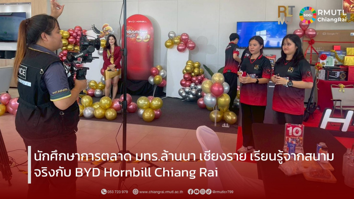 เมื่อวันที่ 11 ตุลาคม 2568 คณาจารย์หลักสูตรการตลาด นำโดย ผู้ช่วยศาสตราจารย์ศิรินาฏ จันทนะเปลิน หัวหน้าหลักสูตรการตลาด มหาวิทยาลัยเทคโนโลยีราชมงคลล้านนา เชียงราย พานักศึกษาหลักสูตรการตลาดและการตลาดดิจิทัล เข้าร่วมกิจกรรม “เรียนรู้จากสนามจริงกับ BYD Hornbill Chiang Rai” ในงานเฉลิมฉลอง ครบรอบ 50 ปี กลุ่มนกเงือก (Hornbill Group) ณ ตำบลสันทราย อำเภอเมือง จังหวัดเชียงราย