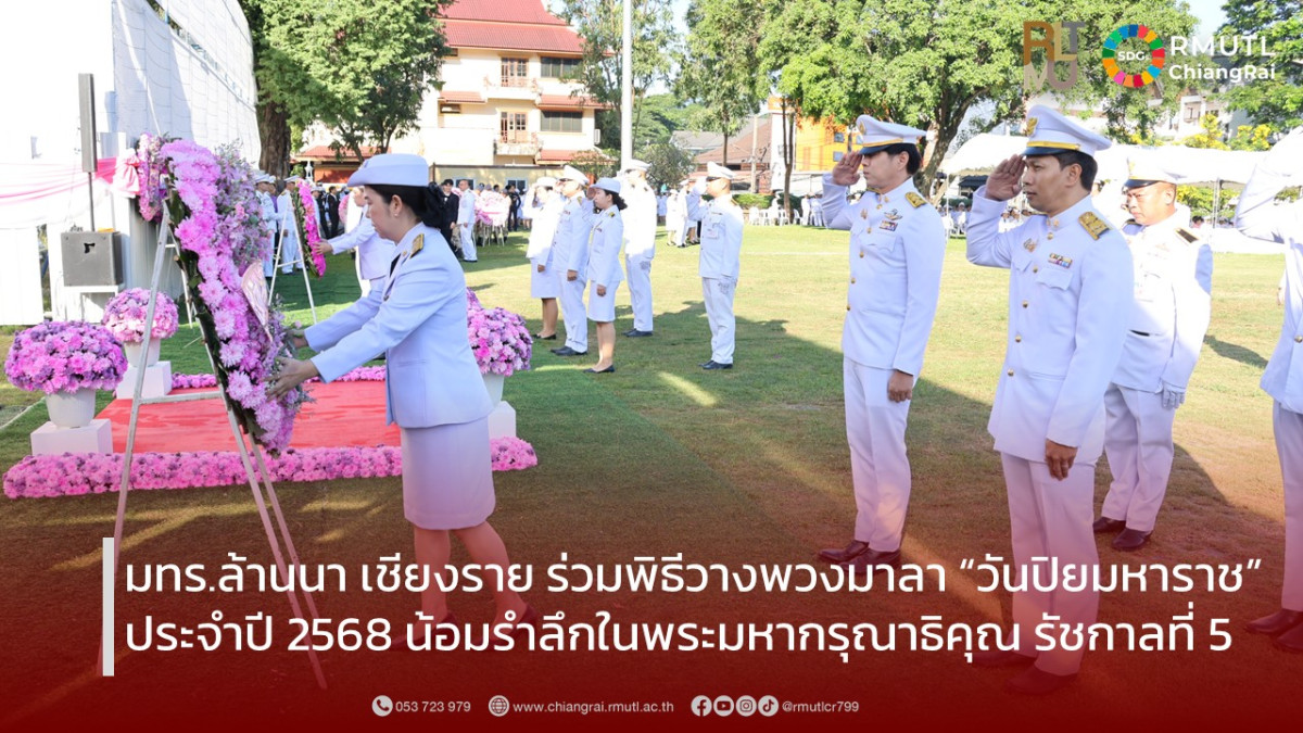 วันนี้ (23 ตุลาคม 2568) มหาวิทยาลัยเทคโนโลยีราชมงคลล้านนา เชียงราย นำโดย ผู้ช่วยศาสตราจารย์ ดร.ชไมพร รัตนเจริญชัย ผู้อำนวยการสำนักงานบริหาร, ผู้ช่วยศาสตราจารย์ ดร.ณภัทร ทิพย์ศรี รองคณบดีคณะบริหารธุรกิจและศิลปศาสตร์ พร้อมด้วยคณาจารย์และบุคลากร เข้าร่วม พิธีวางพวงมาลาถวายราชสักการะเบื้องหน้าพระบรมราชานุสาวรีย์ พระบาทสมเด็จพระจุลจอมเกล้าเจ้าอยู่หัว รัชกาลที่ 5 ณ ลานพระบรมราชานุสาวรีย์ฯ (ศาลากลางจังหวัดหลังแรก) ตำบลเวียง อำเภอเมืองเชียงราย และที่ว่าการอำเภอพาน จังหวัดเชียงราย