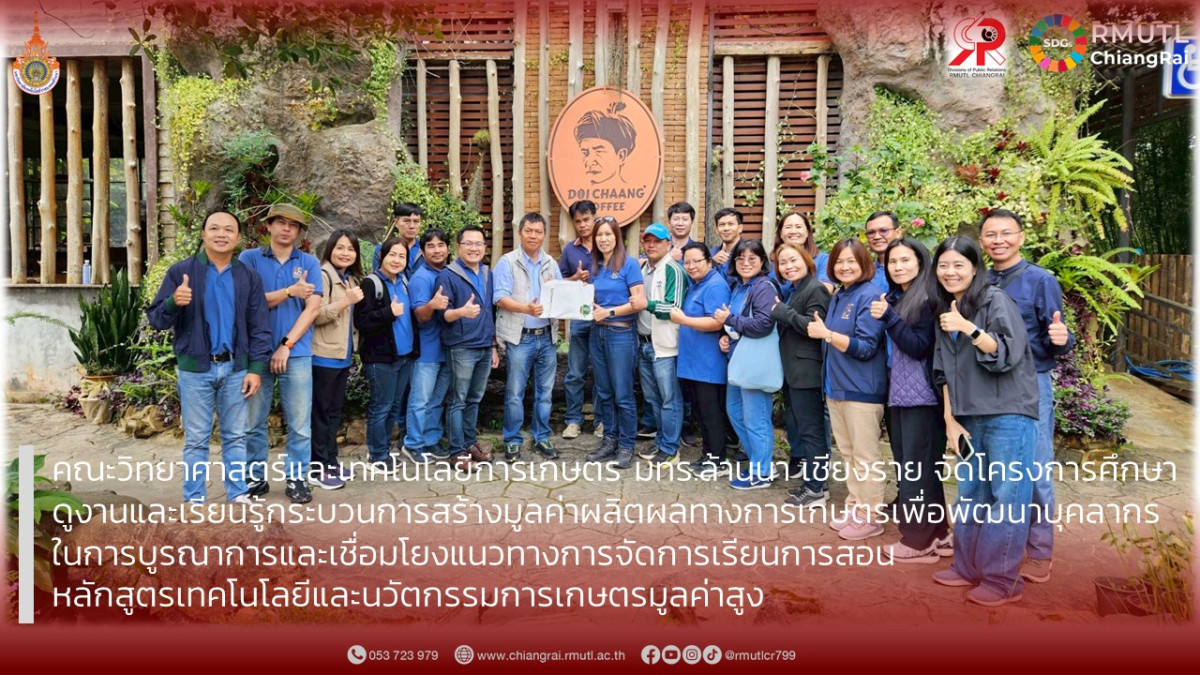 ระหว่างวันที่ 25 - 27 ตุลาคม 2568 คณะวิทยาศาสตร์และเทคโนโลยีการเกษตร มหาวิทยาลัยเทคโนโลยีราชมงคลล้านนา เชียงราย จัดโครงการศึกษาดูงานและเรียนรู้กระบวนการสร้างมูลค่า ผลิตผลทางการเกษตรเพื่อพัฒนาบุคลากร ในการ บูรณาการและเชื่อมโยง แนวทางการจัดการเรียนการสอนหลักสูตรเทคโนโลยีและนวัตกรรมการเกษตรมูลค่าสูง ซึ่งได้รับความอนุเคราะห์จากสถานประกอบการและหน่วยงานที่เกี่ยวข้องกับภาคเกษตรกรรม ในการเข้าศึกษาดูงาน และประชุมหารือความร่วมมือทางวิชาการร่วมกับสถานประกอบการภาคการเกษตรในจังหวัดเชียงราย ได้แก่