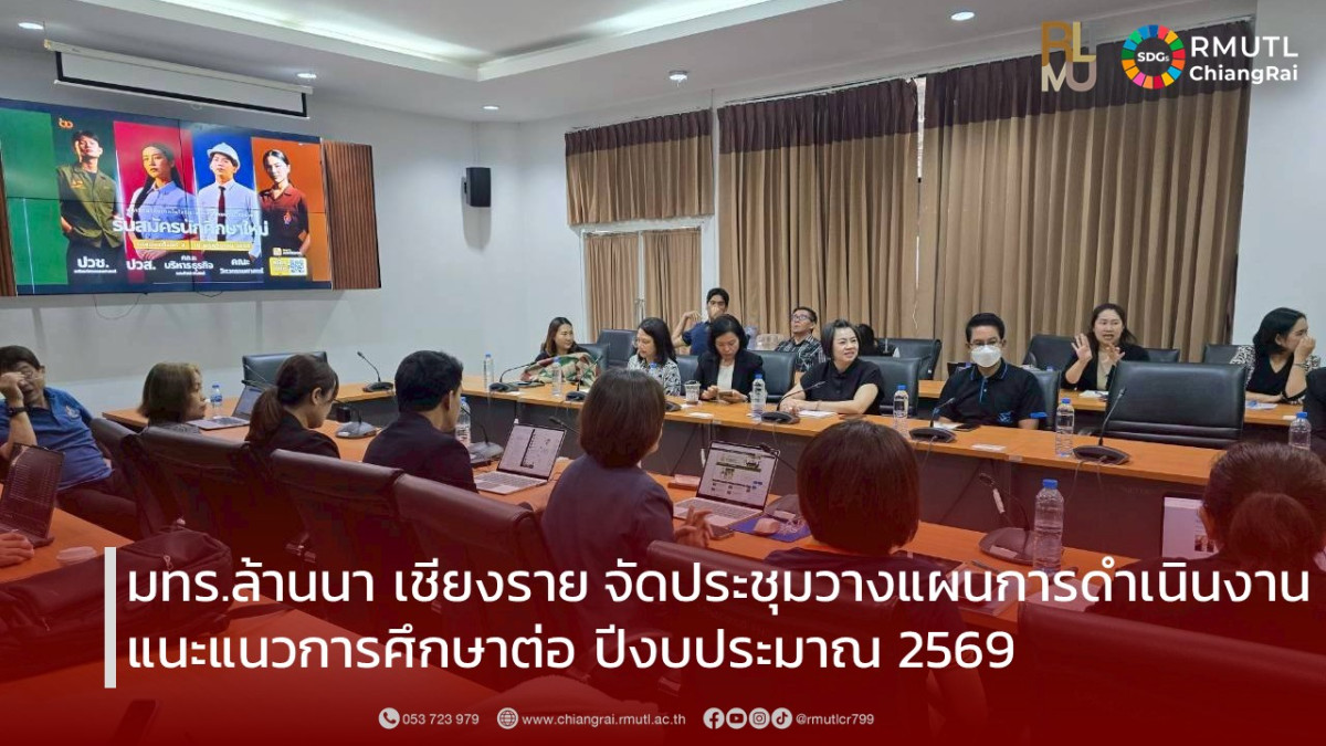 วันที่ 4 พฤศจิกายน 2568 เวลา 09.00 น. กองการศึกษา มหาวิทยาลัยเทคโนโลยีราชมงคลล้านนา เชียงราย ได้จัดการประชุมวางแผนแนะแนวการศึกษาต่อสำหรับปีงบประมาณ 2569 โดยมี ผู้ช่วยศาสตราจารย์ ดร.ชไมพร รัตนเจริญชัย ผู้อำนวยการสำนักงานบริหาร มหาวิทยาลัยเทคโนโลยีราชมงคลล้านนา เชียงราย เป็นประธานการประชุม และมี ผู้ช่วยศาสตราจารย์ ดร.ณภัทร ทิพย์ศรี รองคณบดีคณะบริหารธุรกิจฯ และ นางณัชชา ทิพย์ประเสริฐ ผู้อำนวยการกองการศึกษาเชียงราย รวมถึงคณาจารย์และบุคลากรผู้เกี่ยวข้องเข้าร่วมประชุม