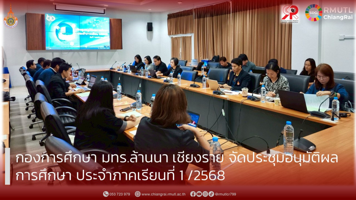 วันที่ 7 พฤศจิกายน 2568 กองการศึกษา มหาวิทยาลัยเทคโนโลยีราชมงคลล้านนา เชียงราย จัดประชุมอนุมัติผลการศึกษา ประจำภาคเรียนที่ 1 ปีการศึกษา 2568 ณ ห้องประชุม 1 ชั้น 3 อาคารสำนักงานบริหาร โดยมีคณะกรรมการประจำกองการศึกษาเข้าร่วมประชุมเพื่อพิจารณาและอนุมัติผลการเรียนของนักศึกษาในทุกหลักสูตรอย่างเป็นทางการ