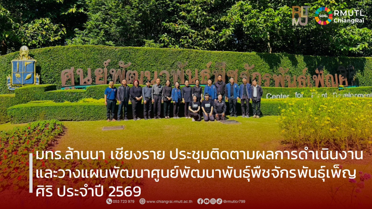 วันที่ 13 พฤศจิกายน 2568 มหาวิทยาลัยเทคโนโลยีราชมงคลล้านนา เชียงราย นำโดย ผู้ช่วยศาสตราจารย์พิสิษฐ์ วิมลธนสิทธิ์ รองอธิการบดีฝ่ายแผน นโยบายและยุทธศาสตร์ พร้อมด้วย ผู้ช่วยศาสตราจารย์ ดร.ชไมพร รัตนเจริญชัย ผู้อำนวยการสำนักงานบริหารเชียงราย, ผู้ช่วยศาสตราจารย์ ดร.อภิชาติ ชิดบุรี ผู้อำนวยการสถาบันวิจัยเทคโนโลยีเกษตร และคณะทำงาน เข้าร่วมการประชุมรายงานผลการดำเนินงาน รวมถึงปัญหาและอุปสรรคในการสนองงาน ศูนย์พัฒนาพันธุ์พืชจักรพันธุ์เพ็ญศิริ อำเภอแม่สาย จังหวัดเชียงราย ครั้งที่ 4/2568