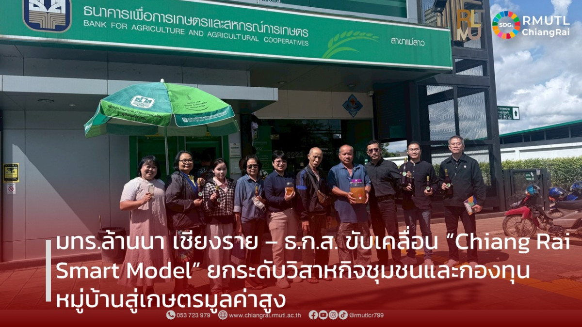 วันที่ 14 พฤศจิกายน 2568 – มหาวิทยาลัยเทคโนโลยีราชมงคลล้านนา (มทร.ล้านนา) เชียงราย ร่วมกับธนาคารเพื่อการเกษตรและสหกรณ์การเกษตร (ธ.ก.ส.) สาขาเชียงรายและสาขาแม่ลาว ขับเคลื่อนโครงการพัฒนาศักยภาพวิสาหกิจชุมชนและกองทุนหมู่บ้านสู่เกษตรมูลค่าสูง ประจำปีบัญชี 2568 ภายใต้โมเดลการพัฒนาเครือข่ายผู้ประกอบการทางสังคม “Chiang Rai Smart Model” มุ่งสร้างนวัตกรรมชุมชน เพิ่มรายได้ และยกระดับเศรษฐกิจสีเขียวอย่างยั่งยืน