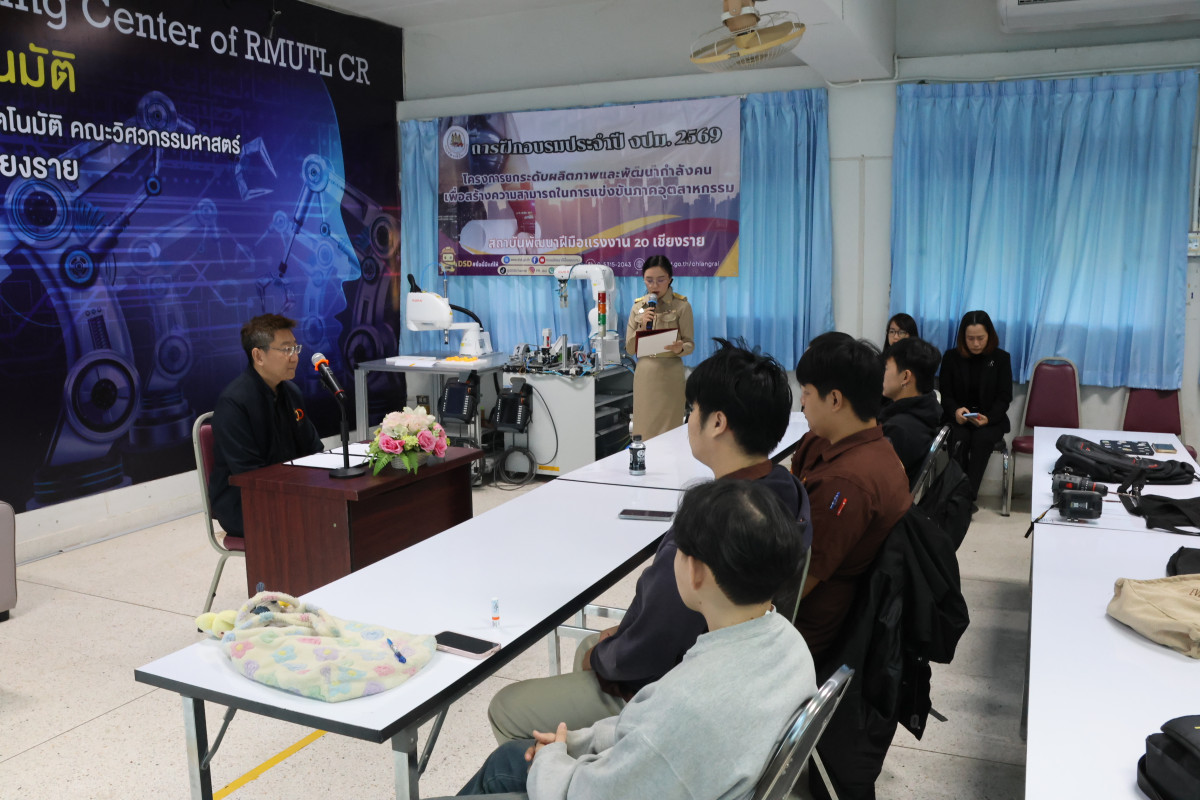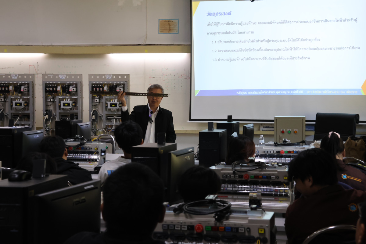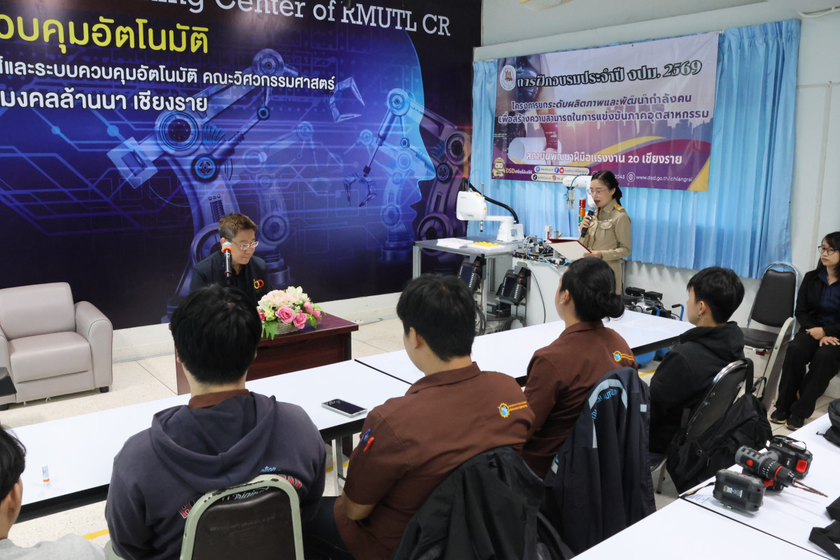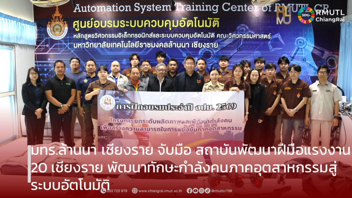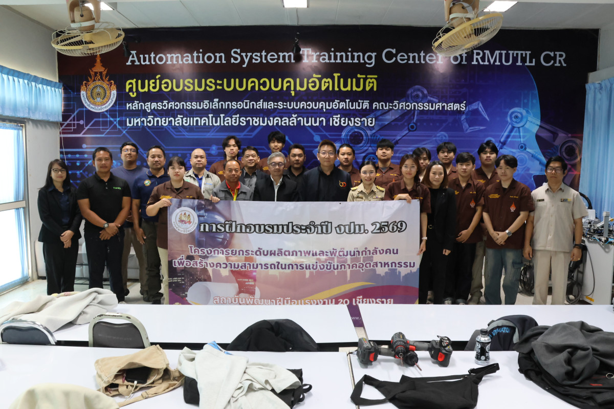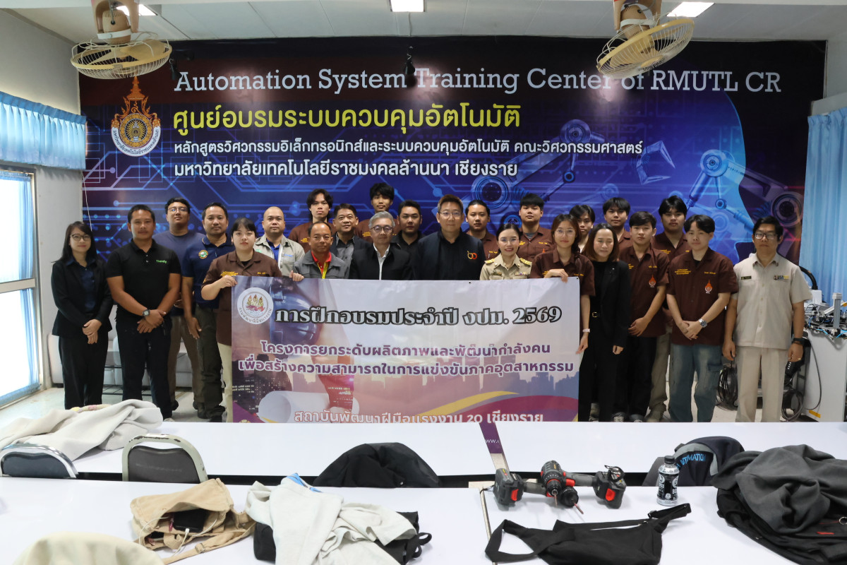 มหาวิทยาลัยเทคโนโลยีราชมงคลล้านนา เชียงราย ร่วมกับ สถาบันพัฒนาฝีมือแรงงาน 20 เชียงราย จัดโครงการ “ยกระดับผลิตภาพและพัฒนากำลังคนเพื่อสร้างความสามารถในการแข่งขันภาคอุตสาหกรรม” โดยมีการอบรมเชิงปฏิบัติการในหลักสูตร การเดินสายไฟฟ้าสำหรับตู้ควบคุมระบบอัตโนมัติ รวม 30 ชั่วโมง ระหว่างวันที่ 24 – 27 พฤศจิกายน 2568 ณ อาคารวิศวกรรมศาสตร์ มหาวิทยาลัยเทคโนโลยีราชมงคลล้านนา เชียงราย