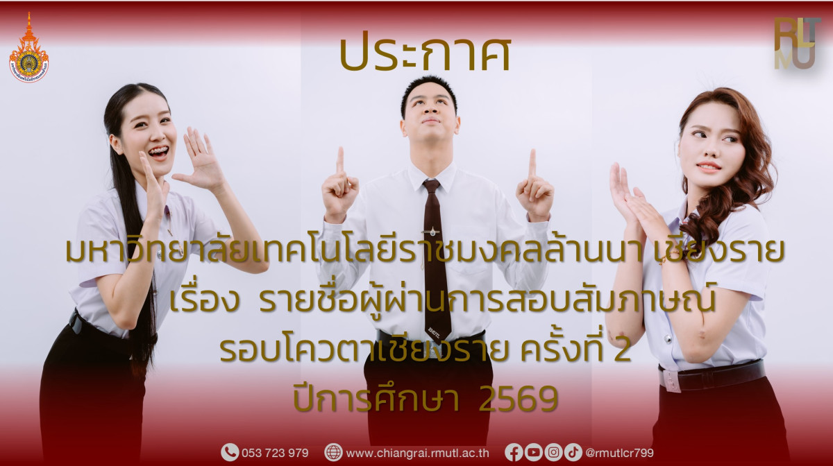 มหาวิทยาลัยเทคโนโลยีราชมงคลล้านนา เชียงราย จึงประกาศรายชื่อผู้ผ่านการสอบสัมภาษณ์ ในระดับประกาศนียบัตรวิชาชีพ (ปวช.) ,ประกาศนียบัตรวิชาชีพชั้นสูง (ปวส.) และระดับปริญญาตรี ในรอบโควตาเชียงรายครั้งที่ 2 ปีการศึกษา 2569 ตามเอกสารแนบท้ายประกาศและให้ผู้ที่มีรายชื่อดังกล่าวดำเนินการดังนี้