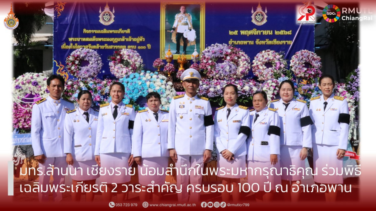 วันที่ 25 พฤศจิกายน 2568 มหาวิทยาลัยเทคโนโลยีราชมงคลล้านนา เชียงราย โดย นางโสมวรรณ ทิพจร ผู้อำนวยการกองบริหารทรัพยากร พร้อมด้วยคณะบุคลากร ได้เข้าร่วมกิจกรรมเฉลิมพระเกียรติน้อมรำลึกในพระมหากรุณาธิคุณอันหาที่สุดมิได้ ของสองพระองค์ผู้ทรงมีคุณูปการต่อประเทศชาติ เนื่องในโอกาสสำคัญ 2 วาระ คือ วันคล้ายวันสวรรคตครบ 100 ปี พระบาทสมเด็จพระมงกุฎเกล้าเจ้าอยู่หัว (รัชกาลที่ 6) และ วันคล้ายวันประสูติครบ 100 ปี สมเด็จพระเจ้าภคินีเธอ เจ้าฟ้าเพชรรัตนราชสุดา สิริโสภาพัณณวดี กิจกรรมดังกล่าวจัดขึ้นอย่างสมพระเกียรติ ณ หอประชุมอำเภอพาน และลานหน้าที่ว่าการอำเภอพาน โดยมีลำดับพิธีการที่บุคลากรของมหาวิทยาลัยฯ เข้าร่วมดังนี้