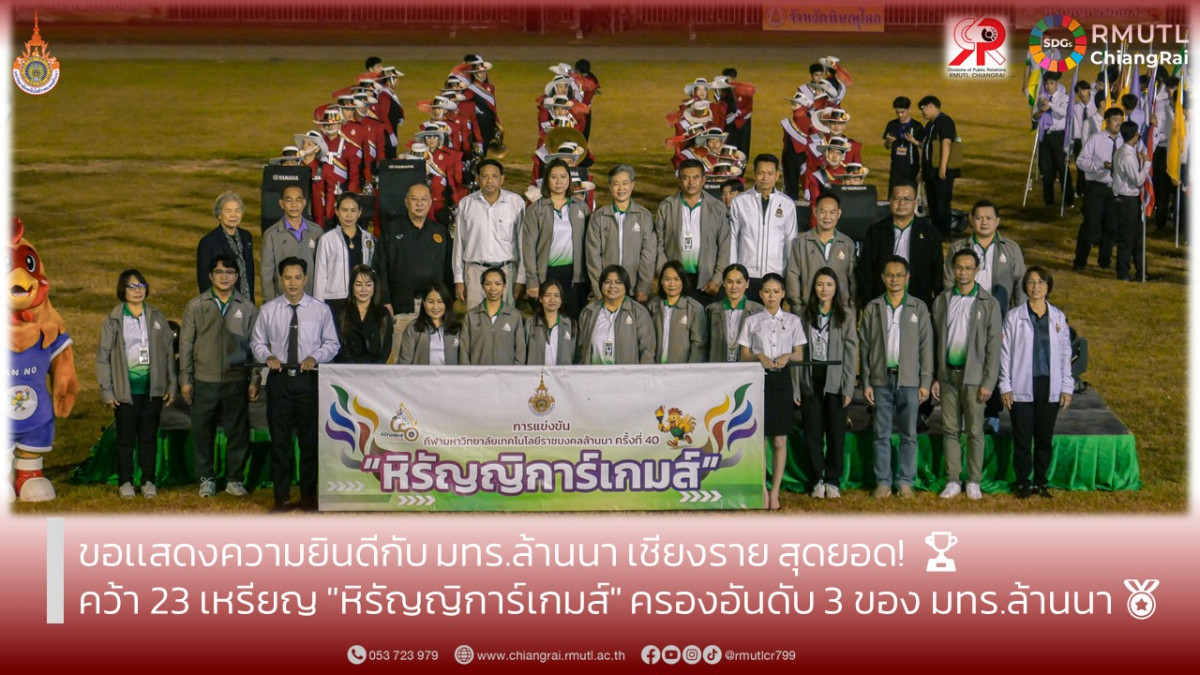 มหาวิทยาลัยเทคโนโลยีราชมงคลล้านนา เชียงราย ขอแสดงความยินดี และชื่นชมทัพนักกีฬาและ ผู้ฝึกสอน ที่สร้างผลงานโดดเด่น ในการแข่งขันกีฬามหาวิทยาลัยเทคโนโลยีราชมงคลล้านนา ครั้งที่ 40 "หิรัญญิการ์เกมส์" ณ มทร.ล้านนา พิษณุโลก โดยสามารถคว้าเหรียญรางวัลรวมได้ถึง 23 เหรียญ ประกอบด้วย 6 เหรียญทอง, 8 เหรียญเงิน, และ 9 เหรียญทองแดง ส่งผลให้ มทร.ล้านนา เชียงราย คว้าอันดับ 3 จากจำนวน 6 เขตพื้นที่ทั้งหมด