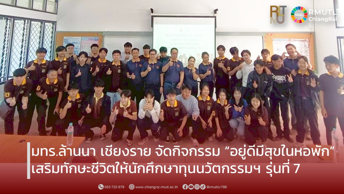 วันที่ 10 ธันวาคม 2568 มหาวิทยาลัยเทคโนโลยีราชมงคลล้านนา เชียงราย โดยคณะกรรมการพัฒนาระบบดูแลความเป็นอยู่และสวัสดิภาพของนักศึกษาโครงการทุนนวัตกรรมสายอาชีพชั้นสูง นำโดย อาจารย์ภีราวิชญ์ ชัยมาลา หัวหน้าโครงการ จัดกิจกรรม “อยู่ดีมีสุขในหอพัก” เพื่อเสริมสร้างทักษะชีวิตและเตรียมความพร้อมให้นักศึกษาโครงการทุนนวัตกรรมสายอาชีพชั้นสูง รุ่นที่ 7 ได้เรียนรู้และพัฒนาศักยภาพในด้านต่าง ๆ นอกเหนือจากการเรียนในชั้นเรียน