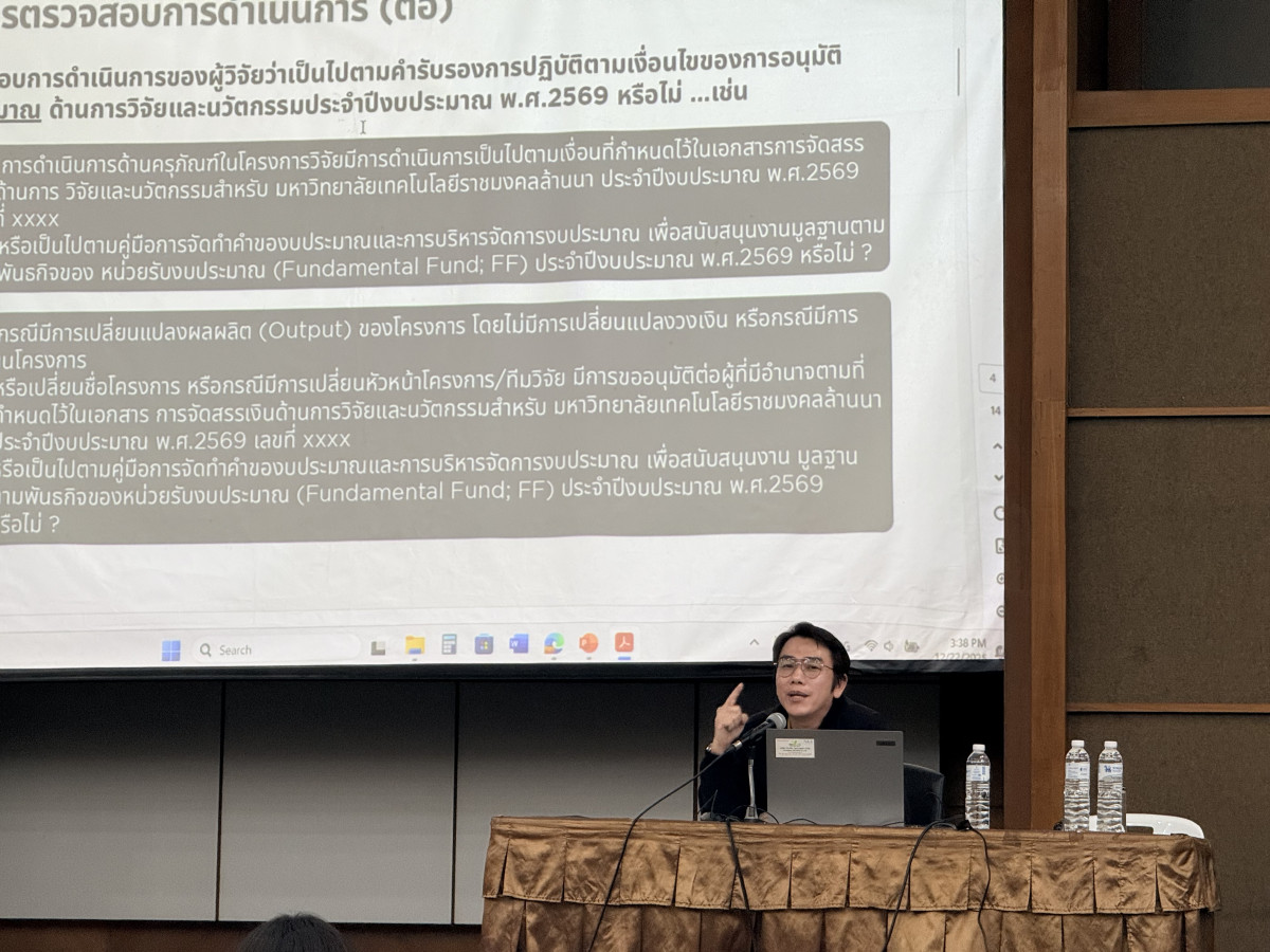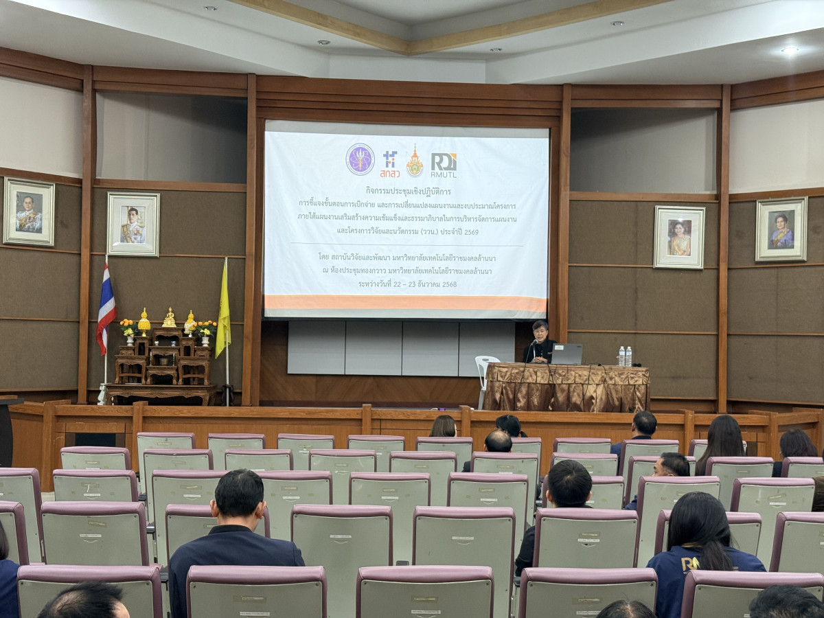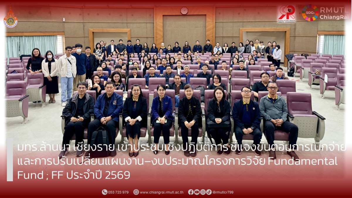 สถาบันวิจัยและพัฒนา มหาวิทยาลัยเทคโนโลยีราชมงคลล้านนา (สวพ. มทร.ล้านนา) จัดกิจกรรมประชุมเชิงปฏิบัติการ เรื่อง การชี้แจงขั้นตอนการเบิกจ่าย และการปรับเปลี่ยนแผนงานและงบประมาณโครงการ ภายใต้แผนงานเสริมสร้างความเข้มแข็งและธรรมาภิบาลในการบริหารจัดการแผนงานและโครงการวิจัยและนวัตกรรม (ววน.) ประจำปี 2569 ระหว่างวันที่ 22 – 23 ธันวาคม 2568 ณ มหาวิทยาลัยเทคโนโลยีราชมงคลล้านนา เชียงใหม่