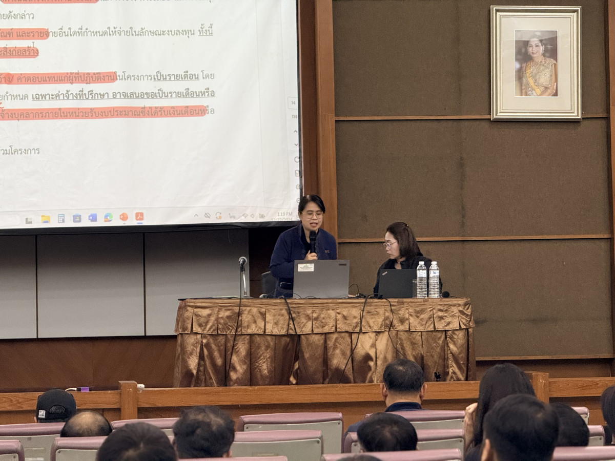 กิจกรรมในวันที่ 22 ธันวาคม 2568 เริ่มต้นด้วยการลงทะเบียนผู้เข้าร่วมงานและพิธีเปิดโครงการ โดยได้รับเกียรติจาก ผู้ช่วยศาสตราจารย์วิสุตร อาสนวิจิตร รองผู้อำนวยการสถาบันวิจัยและพัฒนา กล่าวรายงาน และ ผู้ช่วยศาสตราจารย์ ดร.สุภาวดี ศรีแย้ม รองอธิการบดีฝ่ายวิจัยและนวัตกรรม กล่าวเปิดโครงการ จากนั้นเป็นการบรรยายชี้แจงแนวทางขั้นตอนการเบิกจ่ายงบประมาณโครงการวิจัย การขออนุมัติปรับเปลี่ยนงบประมาณและแผนการดำเนินงาน โดย นางสาวสุปราณี ส้มปุรณะพันธ์ ผู้อำนวยการกองคลัง และการชี้แจงแนวทางการตรวจสอบโครงการวิจัย โดย ว่าที่ร้อยตรี รัชตพงษ์ หอชัยรัตน์ รักษาการหัวหน้าสำนักงานผู้อำนวยการสถาบันวิจัยและพัฒนา