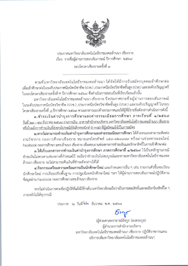 ประกาศมหาวิทยาลัยเทคโนโลยีราชมงคลล้านนา เชียงราย