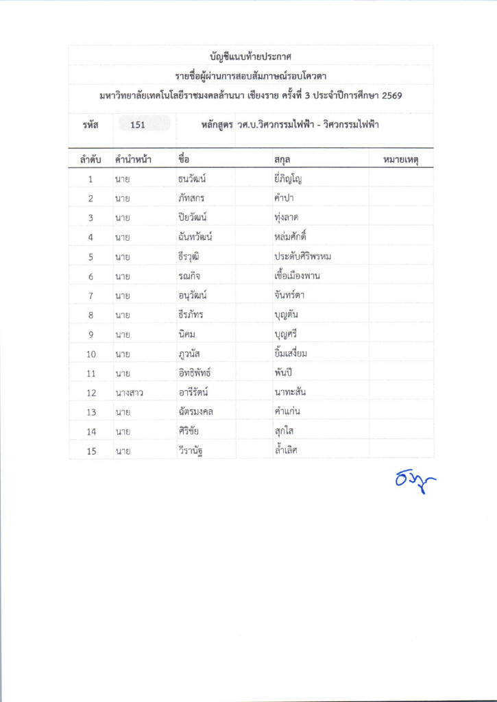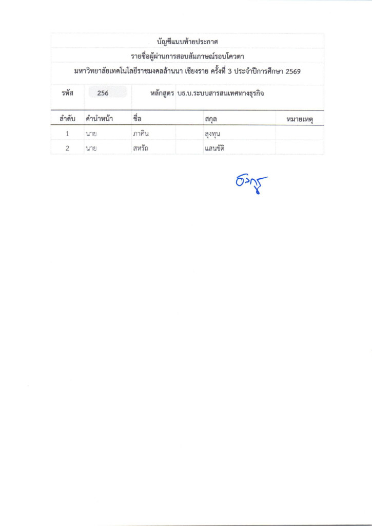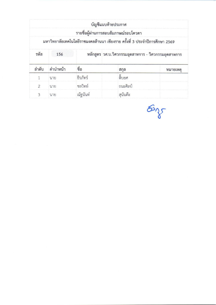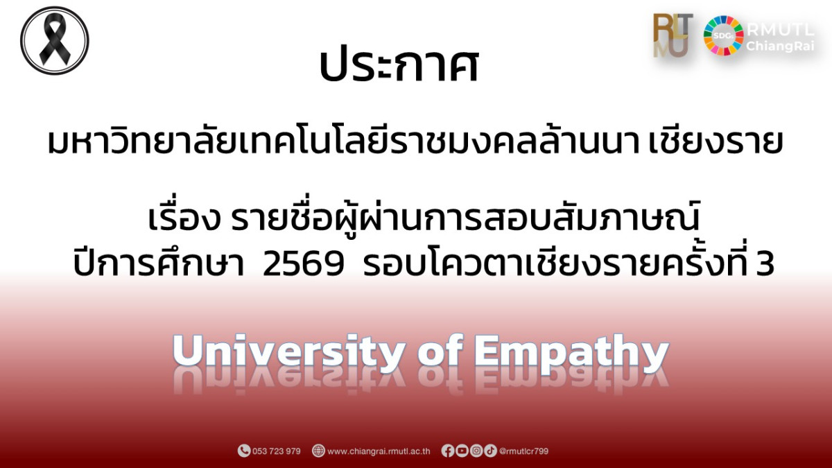 ตามที่มหาวิทยาลัยเทคโนโลยีราชมงคลล้านนา ได้จัดให้มีการรับสมัครบุคคลเข้าศึกษาต่อ เพื่อเข้าศึกษาต่อในระดับประกาศนียบัตรวิชาชีพ (ปวช.) ,ประกาศนียบัตรวิชาชีพชั้นสูง (ปวส.) และระดับปริญญาตรี ในรอบโควตาเชียงรายครั้งที่ 3 ปีการศึกษา 2569 ซึ่งดำเนินการสอบเป็นที่เรียบร้อยแล้วนั้น มหาวิทยาลัยเทคโนโลยีราชมงคลล้านนา เชียงราย จึงประกาศรายชื่อผู้ผ่านการสอบสัมภาษณ์ ในระดับประกาศนียบัตรวิชาชีพ (ปวช.) ,ประกาศนียบัตรวิชาชีพชั้นสูง (ปวส.) และระดับปริญญาตรี ในรอบโควตาเชียงรายครั้งที่ 3 ปีการศึกษา 2569 ตามเอกสารแนบท้ายประกาศและให้ผู้ที่มีรายชื่อดังกล่าวดำเนินการดังนี้