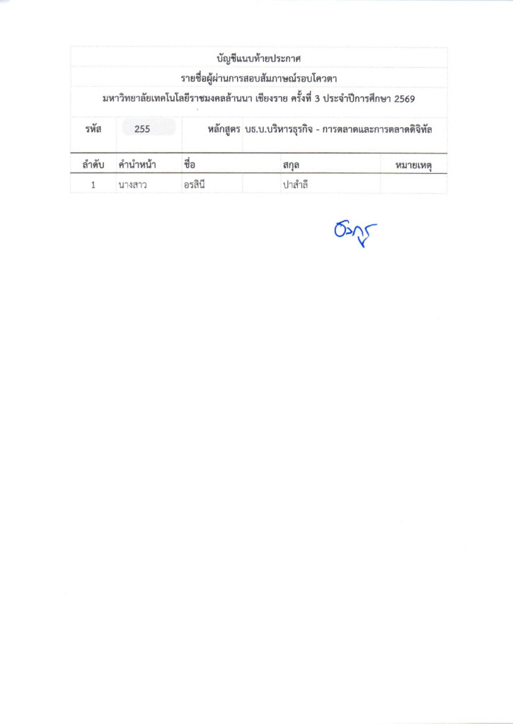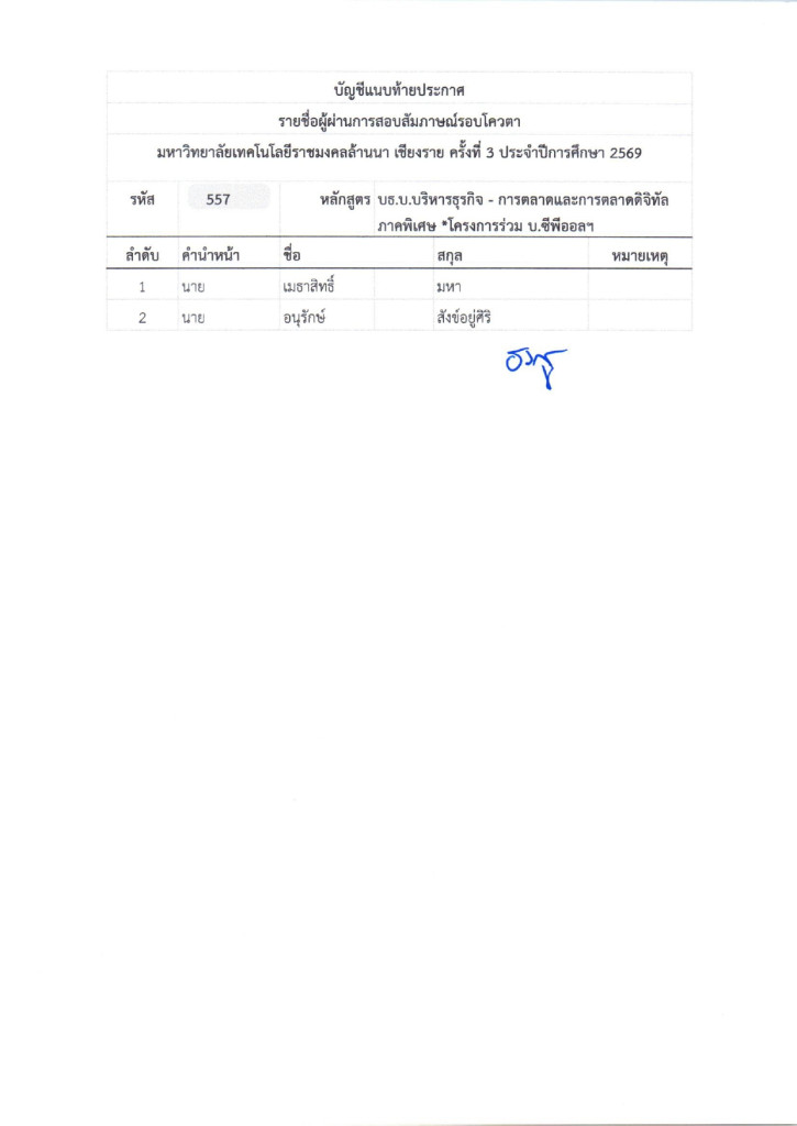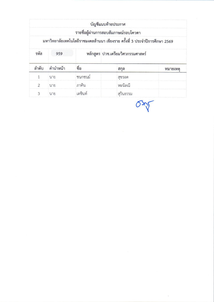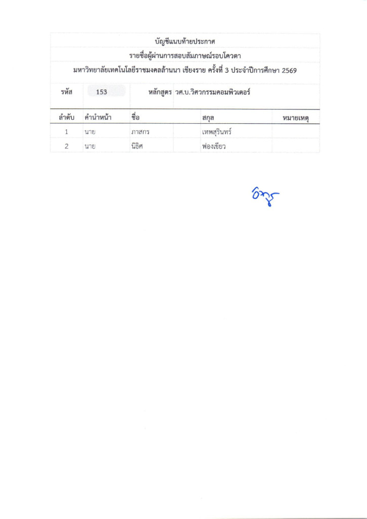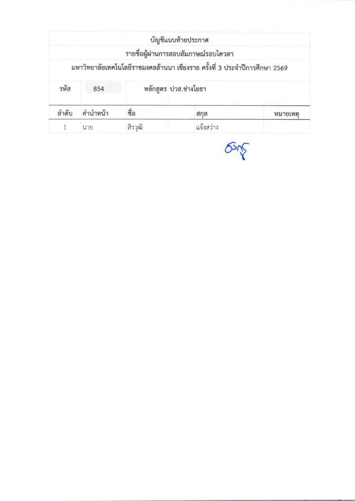 ตามที่มหาวิทยาลัยเทคโนโลยีราชมงคลล้านนา ได้จัดให้มีการรับสมัครบุคคลเข้าศึกษาต่อ เพื่อเข้าศึกษาต่อในระดับประกาศนียบัตรวิชาชีพ (ปวช.) ,ประกาศนียบัตรวิชาชีพชั้นสูง (ปวส.) และระดับปริญญาตรี ในรอบโควตาเชียงรายครั้งที่ 3 ปีการศึกษา 2569 ซึ่งดำเนินการสอบเป็นที่เรียบร้อยแล้วนั้น มหาวิทยาลัยเทคโนโลยีราชมงคลล้านนา เชียงราย จึงประกาศรายชื่อผู้ผ่านการสอบสัมภาษณ์ ในระดับประกาศนียบัตรวิชาชีพ (ปวช.) ,ประกาศนียบัตรวิชาชีพชั้นสูง (ปวส.) และระดับปริญญาตรี ในรอบโควตาเชียงรายครั้งที่ 3 ปีการศึกษา 2569 ตามเอกสารแนบท้ายประกาศและให้ผู้ที่มีรายชื่อดังกล่าวดำเนินการดังนี้