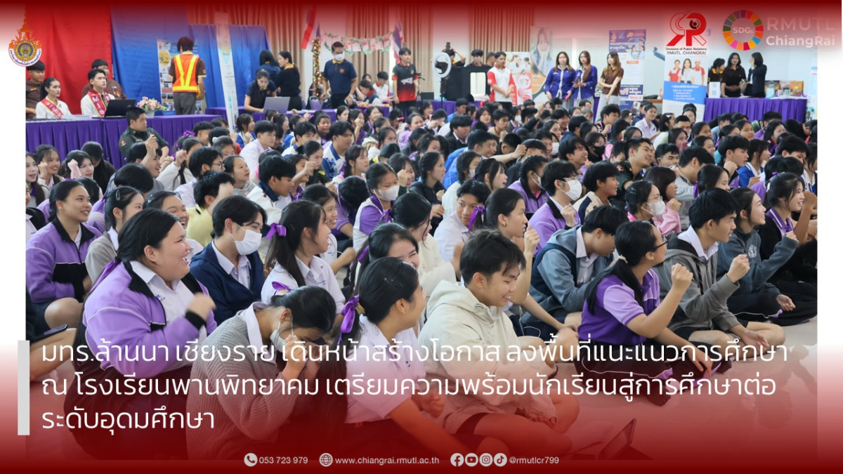 วันที 24 ธันวาคม พ.ศ. 2568 ทีมแนะแนวการศึกษา พร้อมด้วยคณะอาจารย์และนักศึกษา จากมหาวิทยาลัยเทคโนโลยีราชมงคลล้านนา เชียงราย ได้ดำเนินการจัดกิจกรรมแนะแนวการศึกษา และประชาสัมพันธ์หลักสูตรที่เปิดรับสมัครนักศึกษาใหม่ ประจำปีการศึกษา 2569 ณ โรงเรียนพานพิทยาคม อำเภอพาน จังหวัดเชียงราย โดยมีนักเรียนระดับมัธยมศึกษาปีที่ 6 เข้าร่วมกิจกรรมเป็นจำนวนมาก