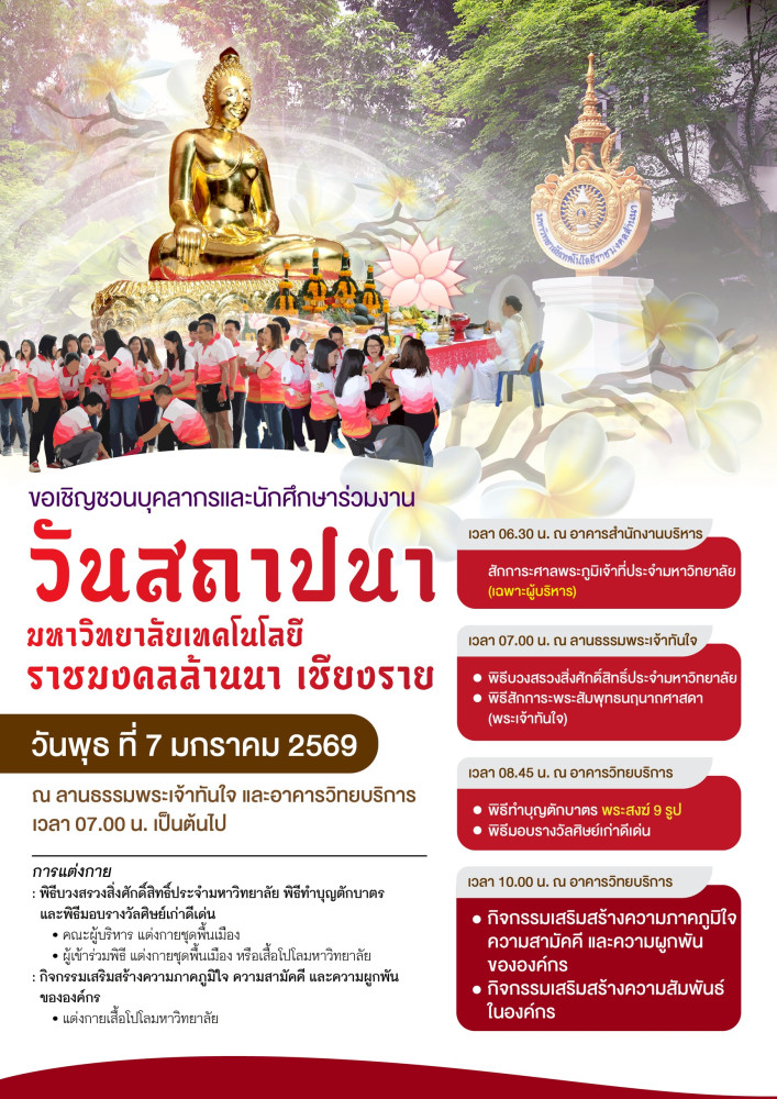 ขอเชิญร่วมงาน “วันสถาปนา มหาวิทยาลัยเทคโนโลยีราชมงคลล้านนา เชียงราย” ![]()