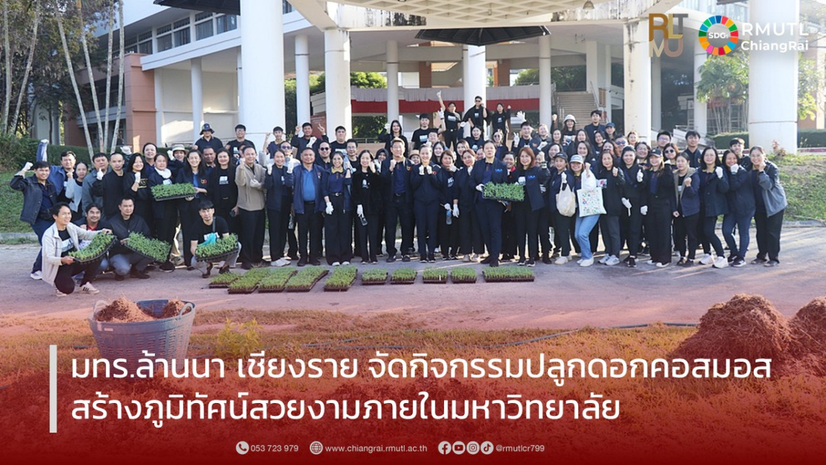 มหาวิทยาลัยเทคโนโลยีราชมงคลล้านนา เชียงราย จัดกิจกรรมปลูกดอกคอสมอส เพื่อส่งเสริมการมีส่วนร่วมของผู้บริหาร คณาจารย์ และบุคลากร ในการร่วมกันพัฒนาภูมิทัศน์และสร้างบรรยากาศที่ร่มรื่น สวยงาม ภายในพื้นที่มหาวิทยาลัย ณ บริเวณอาคารสำนักงานบริหาร มทร.ล้านนา เชียงราย โดยมี ผู้ช่วยศาสตราจารย์ ดร.อังกูร ว่องตระกูล ผู้อำนวยการสำนักงานบริหาร มทร.ล้านนา เชียงราย เป็นประธานในกิจกรรม พร้อมด้วย นางโสมวรรณ ทิพจร ผู้อำนวยการกองบริหารทรัพยากร นางณัชชา ทิพย์ประเสริฐ ผู้อำนวยการกองการศึกษา ผู้ช่วยศาสตราจารย์ ดร.ณภัทร ทิพย์ศรี รองคณบดีคณะบริหารธุรกิจและศิลปศาสตร์ ตลอดจนคณาจารย์และบุคลากร เข้าร่วมกิจกรรมอย่างพร้อมเพรียง