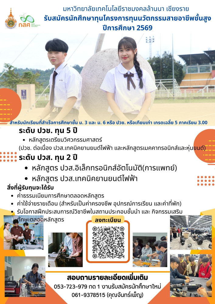 มหาวิทยาลัยเทคโนโลยีราชมงคลล้านนา เชียงราย เปิดรับสมัครนักศึกษาใหม่เข้าศึกษาภายใต้ โครงการทุนนวัตกรรมสายอาชีพชั้นสูง ประจำปีการศึกษา 2569 เพื่อส่งเสริมโอกาสทางการศึกษาและพัฒนากำลังคนสายอาชีพให้มีสมรรถนะสูง ตอบโจทย์ความต้องการของภาคอุตสาหกรรมและตลาดแรงงานในอนาคต
