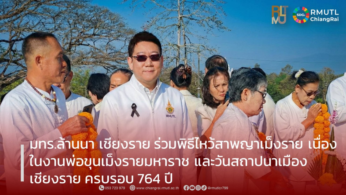 วันที่ 25 มกราคม 2569 ผู้ช่วยศาสตราจารย์ ดร.อังกูร ว่องตระกูล ผู้อำนวยการสำนักงานบริหาร มหาวิทยาลัยเทคโนโลยีราชมงคลล้านนา เชียงราย เข้าร่วมพิธีไหว้สาพญาเม็งราย ภายใต้งานพ่อขุนเม็งรายมหาราช จังหวัดเชียงราย และพิธีสืบชะตา เนื่องในโอกาสวันสถาปนาเมืองเชียงราย ครบรอบ 764 ปี โดยมี นายอุดม ปกป้องบวรกุล นายอำเภอพาน เป็นประธานในพิธี ณ อนุสาวรีย์พระญามังรายหลวง หมู่ที่ 10 ตำบลทรายขาว อำเภอพาน จังหวัดเชียงราย พร้อมด้วยหัวหน้าส่วนราชการ หน่วยงานภาครัฐ และประชาชนในพื้นที่ เข้าร่วมพิธีอย่างพร้อมเพรียง