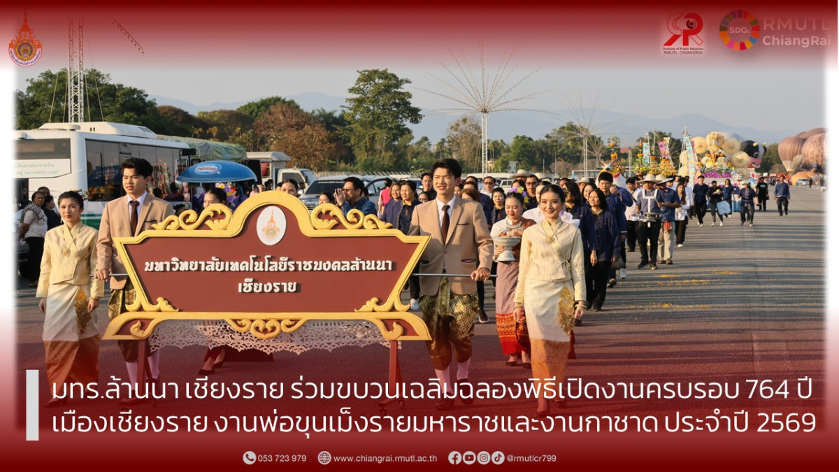 วันที่ 26 มกราคม 2569 มหาวิทยาลัยเทคโนโลยีราชมงคลล้านนา เชียงราย นำโดย ผู้ช่วยศาสตราจารย์ ดร.อังกูร ว่องตระกูล ผู้อำนวยการสำนักงานบริหาร พร้อมด้วยคณะผู้บริหาร คณาจารย์ บุคลากร และนักศึกษา รวมกว่า 120 คน เข้าร่วมขบวนพิธีเปิดงานเฉลิมฉลองครบรอบ 764 ปี การก่อตั้งเมืองเชียงราย ซึ่งจังหวัดเชียงรายจัดขึ้นอย่างยิ่งใหญ่ เพื่อรำลึกถึงพระมหากรุณาธิคุณของ พญามังรายมหาราช ปฐมกษัตริย์ผู้ทรงสร้างเมืองเชียงราย ตลอดจนสืบสานอัตลักษณ์ ประเพณี และวัฒนธรรมอันงดงามของชาวล้านนา