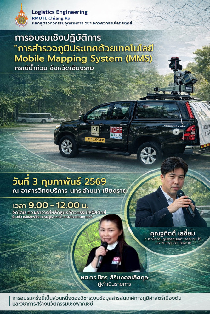 วันที่ 3 กุมภาพันธ์ 2569 มหาวิทยาลัยเทคโนโลยีราชมงคลล้านนา (มทร.ล้านนา) เชียงราย จัดโครงการอบรมเชิงปฏิบัติการหัวข้อ “การสำรวจภูมิประเทศด้วยเทคโนโลยี Mobile Mapping System (MMS) กรณีศึกษาน้ำท่วมจังหวัดเชียงราย” เพื่อเสริมสร้างองค์ความรู้และทักษะด้านเทคโนโลยีภูมิสารสนเทศสมัยใหม่ให้แก่นักศึกษา
