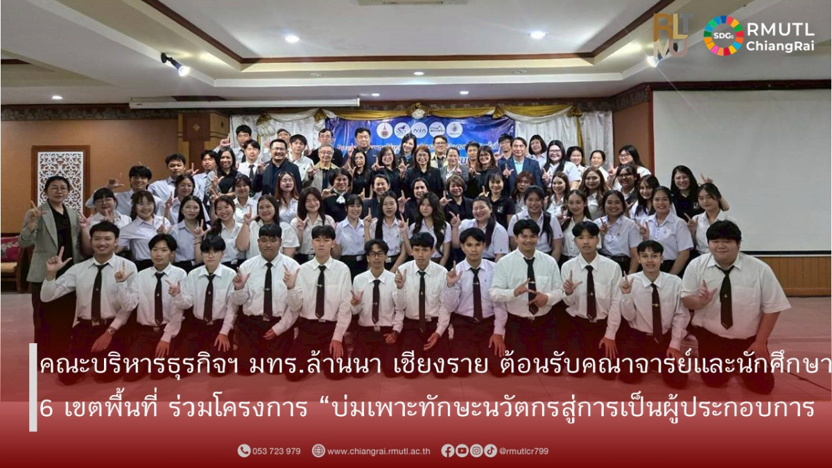 คณะบริหารธุรกิจและศิลปศาสตร์ มหาวิทยาลัยเทคโนโลยีราชมงคลล้านนา เชียงราย ให้การต้อนรับคณาจารย์และนักศึกษา จากมหาวิทยาลัยเทคโนโลยีราชมงคลล้านนา ทั้ง 6 เขตพื้นที่ 3 คณะ ได้แก่ คณะบริหารธุรกิจและศิลปศาสตร์ คณะวิศวกรรมศาสตร์ และคณะวิทยาศาสตร์และเทคโนโลยีการเกษตร เข้าร่วมโครงการ “บ่มเพาะทักษะนวัตกรสู่การเป็นผู้ประกอบการ (Young Smart Entrepreneur 2026)” ระหว่างวันที่ 13 – 16 กุมภาพันธ์ 2569 ณ มหาวิทยาลัยเทคโนโลยีราชมงคลล้านนา เชียงราย และโรงแรมเชียงรายแกรนด์รูม จังหวัดเชียงราย