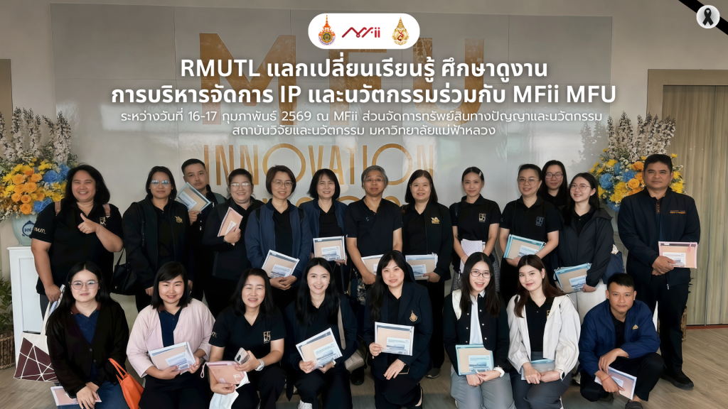 กิจกรรมแลกเปลี่ยนเรียนรู้กระบวนการและแนวปฏิบัติการบริหารจัดการทรัพย์สินทางปัญญาและนวัตกรรม ระหว่างมหาวิทยาลัยแม่ฟ้าหลวง กับ มหาวิทยาลัยเทคโนโลยีราชมงคลล้านนา (Collaborative Knowledge Exchange on IP and Innovation Management MFU X RMUTL)