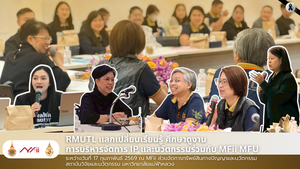 ต่อมาในวันที่ 17 กุมภาพันธ์ 2569 รองศาสตราจารย์ว่าที่ร้อยตรีทนงศักดิ์ สัสดีแพง รองคณบดีวิจัย นวัตกรรมและบริการวิชาการ พร้อมด้วยบุคลากร มทร.ล้านนา เข้าร่วมกิจกรรม “Collaborative Knowledge Exchange on IP and Innovation Management MFU x RMUTL” ณ ห้องประชุมพวงชมพู–พู่ระหงษ์ ชั้น 5 อาคาร L-Park (M-Square) มหาวิทยาลัยแม่ฟ้าหลวง โดยได้รับเกียรติจาก ดร.ชลิดา ธนินกุลภรณ์ หัวหน้าส่วนจัดการทรัพย์สินทางปัญญาและนวัตกรรม ให้การต้อนรับและถ่ายทอดประสบการณ์ด้านกระบวนการบริหารจัดการทรัพย์สินทางปัญญา ตลอดจนแนวปฏิบัติที่เป็นเลิศของมหาวิทยาลัยนอกจากนี้ นางสาวสิรินาฏ เทียนทอง รักษาการแทนหัวหน้าฝ่ายจัดการทรัพย์สินทางปัญญา ได้บรรยายเกี่ยวกับการดำเนินงานด้านการบริหารจัดการทรัพย์สินทางปัญญาและนวัตกรรม รวมถึงระเบียบมหาวิทยาลัยที่เกี่ยวข้องกับผลงานวิจัยและนวัตกรรม พร้อมเปิดเวทีแลกเปลี่ยนความคิดเห็น เพื่อกำหนดแนวทางความร่วมมือด้านการต่อยอดทรัพย์สินทางปัญญาในอนาคต และในช่วงบ่าย คณะได้เยี่ยมชม COSMETIC MAKE SPACE, COSMETIC LAB และโรงงานต้นแบบเครื่องสำอางของมหาวิทยาลัยแม่ฟ้าหลวง รวมถึงพิพิธภัณฑ์อารยธรรมลุ่มน้ำโขง เพื่อเรียนรู้แนวทางการขับเคลื่อนงานวิจัย พัฒนา และเผยแพร่องค์ความรู้ด้านศิลปวัฒนธรรมและอารยธรรมล้านนาและลุ่มน้ำโขง อันเป็นการเชื่อมโยงเครือข่ายความร่วมมือทั้งในประเทศและต่างประเทศ เพื่อธำรงคุณค่าทางวัฒนธรรม และสร้างสรรค์สังคมแห่งปัญญาอย่างยั่งยืน