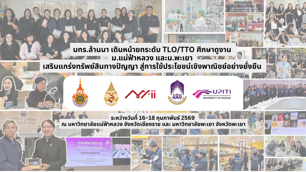 มหาวิทยาลัยเทคโนโลยีราชมงคลล้านนา (มทร.ล้านนา) ดำเนินโครงการ “การยกระดับศักยภาพการบริหารจัดการหน่วยบริหารจัดการทรัพย์สินทางปัญญาและถ่ายทอดเทคโนโลยี (TLO/TTO)” ภายใต้โครงการพัฒนาความเป็นเลิศของสถาบันอุดมศึกษาและพัฒนากำลังคนขั้นสูง (Reinventing University) ประจำปีงบประมาณ 2568 โดยจัดกิจกรรมศึกษาดูงานและแลกเปลี่ยนเรียนรู้ด้านการบริหารจัดการทรัพย์สินทางปัญญา การนำผลงานวิจัยไปใช้ประโยชน์เชิงพาณิชย์และสาธารณประโยชน์ ระหว่างวันที่ 16–18 กุมภาพันธ์ 2569 ณ มหาวิทยาลัยแม่ฟ้าหลวง จังหวัดเชียงราย และ มหาวิทยาลัยพะเยา จังหวัดพะเยา โดยการดำเนินกิจกรรมในครั้งนี้มีวัตถุประสงค์เพื่อพัฒนาศักยภาพบุคลากรผู้ปฏิบัติงานด้านการบริหารจัดการทรัพย์สินทางปัญญาและการเร่งพัฒนาธุรกิจและผู้ประกอบการ ให้สามารถยกระดับทักษะ (Up Skill) และพัฒนากระบวนการทำงานได้อย่างมีประสิทธิภาพ พร้อมทั้งเปิดพื้นที่แลกเปลี่ยนองค์ความรู้ด้านการนำผลงานวิจัยสู่การร่วมลงทุน การต่อยอดนวัตกรรมสู่การใช้ประโยชน์เชิงพาณิชย์และสาธารณประโยชน์ ตลอดจนสร้างเครือข่ายความร่วมมือระหว่างมหาวิทยาลัย