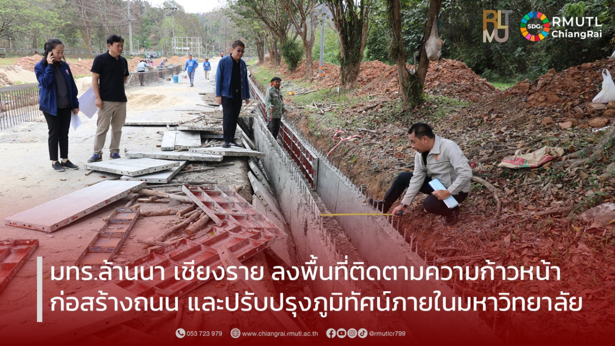วันที่ 25 กุมภาพันธ์ 2569 มหาวิทยาลัยเทคโนโลยีราชมงคลล้านนา เชียงราย นำโดย ผู้ช่วยศาสตราจารย์ ดร.อังกูร ว่องตระกูล ผู้อำนวยการสำนักงานบริหาร มทร.ล้านนา เชียงราย พร้อมด้วย นางโสมวรรณ ทิพจร ผู้อำนวยการกองบริหารทรัพยากรเชียงราย และบุคลากรที่เกี่ยวข้อง ลงพื้นที่ตรวจสอบและติดตามความก้าวหน้าการก่อสร้างถนนบริเวณภายในมหาวิทยาลัย