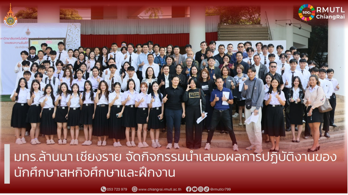 วันที่ 4 มีนาคม 2569 มหาวิทยาลัยเทคโนโลยีราชมงคลล้านนา เชียงราย จัดกิจกรรมนำเสนอผลการปฏิบัติงานของนักศึกษาสหกิจศึกษาและฝึกงาน ณ ลานกิจกรรม อาคารสำนักงานบริหาร ภายในมหาวิทยาลัย เพื่อเปิดโอกาสให้นักศึกษาได้นำเสนอประสบการณ์ ความรู้ และทักษะที่ได้รับจากการออกปฏิบัติงานจริงในสถานประกอบการ