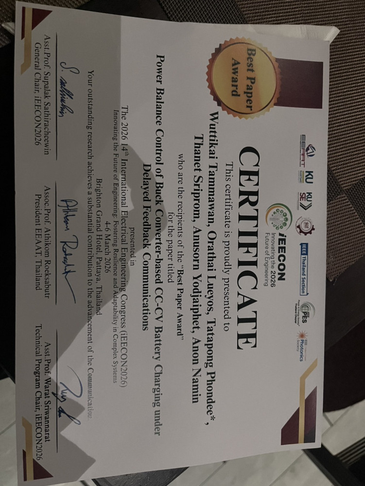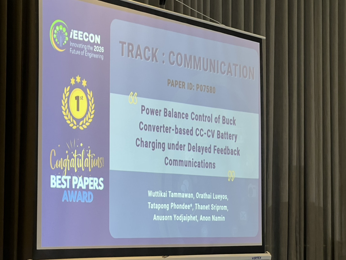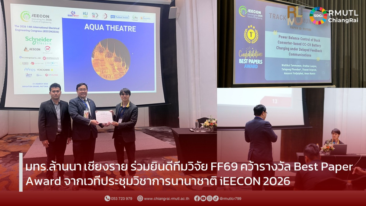 มหาวิทยาลัยเทคโนโลยีราชมงคลล้านนา เชียงราย ขอแสดงความยินดีกับ ทีมวิจัย FF69 จากคณะวิศวกรรมศาสตร์ มหาวิทยาลัยเทคโนโลยีราชมงคลล้านนา ที่ได้รับรางวัล “Best Paper Award” จากผลงานวิจัยเรื่อง “Power Balance Control of Buck Converter-based CC-CV Battery Charging under Delayed Feedback Communications” ในการประชุมวิชาการระดับนานาชาติ The 2026 14th International Electrical Engineering Congress (iEECON) ซึ่งจัดขึ้นระหว่างวันที่ 4–6 มีนาคม 2569 ณ เมืองพัทยา อำเภอบางละมุง จังหวัดชลบุรี ประเทศไทย