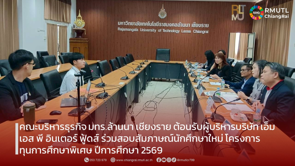 วันที่ 7 มีนาคม 2568 ผู้ช่วยศาสตราจารย์ ดร.ณภัทร ทิพย์ศรี รองคณบดีคณะบริหารธุรกิจ มหาวิทยาลัยเทคโนโลยีราชมงคลล้านนา เชียงราย พร้อมด้วยคณาจารย์จาก คณะบริหารธุรกิจและศิลปศาสตร์ ให้การต้อนรับ คุณณรงค์ ธรรมจารี ประธานผู้ก่อตั้งบริษัท เอ็ม เอส พี อินเตอร์ ฟู้ดส์ จำกัด (หมูอินเตอร์) พร้อมคณะผู้บริหาร ในโอกาสเข้าร่วม การสอบสัมภาษณ์นักศึกษาใหม่ โครงการทุนการศึกษาพิเศษ ประจำปีการศึกษา 2569