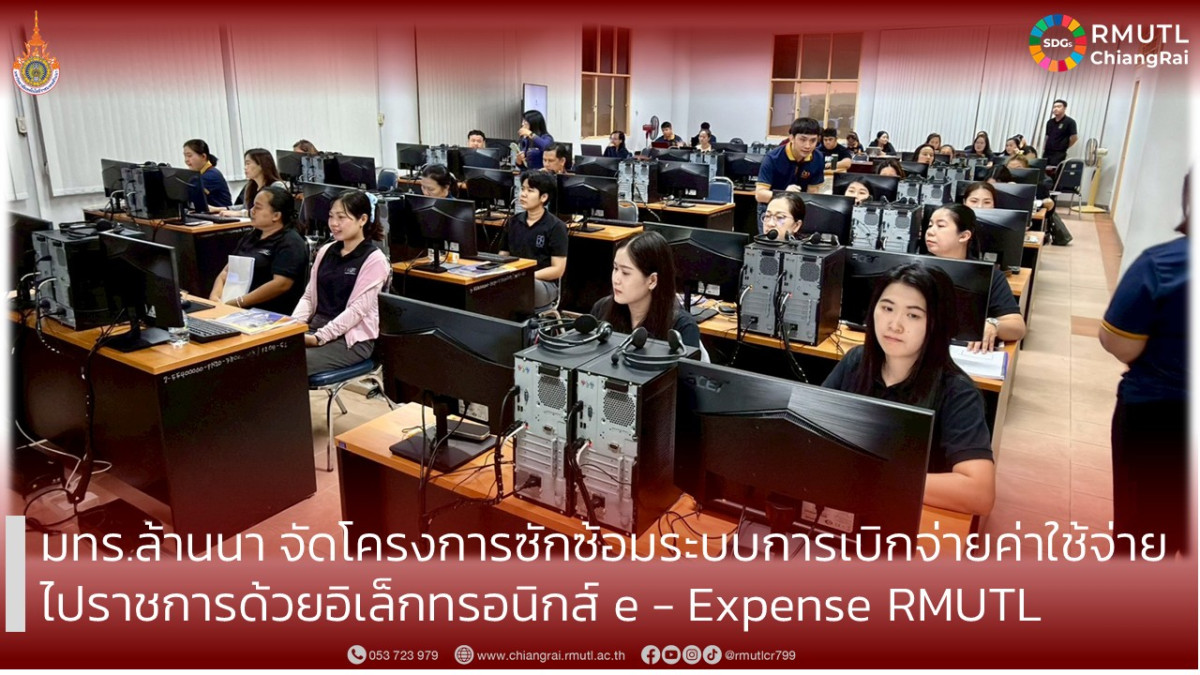 กองคลัง งานบริหารการเงินและงบประมาณ มหาวิทยาลัยเทคโนโลยีราชมงคลล้านนา จัดโครงการซักซ้อมความเข้าใจการใช้งานระบบการเบิกจ่ายค่าใช้จ่ายไปราชการ ด้วยอิเล็กทรอนิกส์ (e–Expense RMUTL) เพื่อเตรียมความพร้อมและสร้างความเข้าใจเกี่ยวกับขั้นตอนการดำเนินงาน ในระบบดังกล่าวให้แก่บุคลากรที่เกี่ยวข้อง กับการดำเนินงานด้านการเงินและการขออนุมัติเดินทางไปราชการของแต่ละพื้นที่