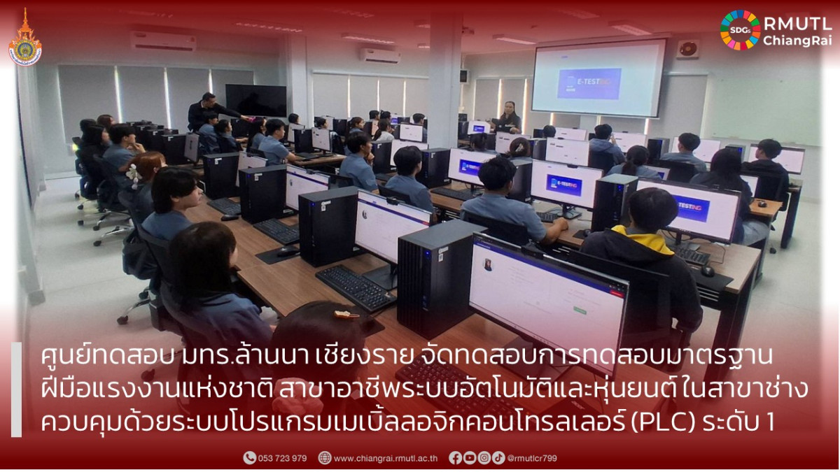 ระหว่างวันที่ 19 – 20 มีนาคม 2569 เวลา 08.00 – 16.30 น. นักศึกษาคณะวิศวกรรมศาสตร์ หลักสูตรประกาศนียบัตรวิชาชีพชั้นสูง ปวส. อิเล็กทรอนิกส์อัตโนมัติ (อิเล็กทรอนิกส์การแพทย์) และนักศึกษา สาขาเมคคาทรอนิกส์และหุ่นยนต์ จากมหาวิทยาลัยเทคโนโลยีราชมงคลล้านนา เชียงราย ได้เข้าร่วมการทดสอบมาตรฐานฝีมือแรงงานแห่งชาติ สาขาอาชีพระบบอัตโนมัติและหุ่นยนต์ ในสาขาช่างควบคุม ด้วยระบบโปรแกรมเมเบิ้ลลอจิกคอนโทรลเลอร์ (PLC) ระดับ 1 ภาคความรู้ E-testing ณ ศูนย์ทดสอบมหาวิทยาลัยเทคโนโลยีราชมงคลล้านนา เชียงราย โดยมีนักศึกษาเข้าร่วมทั้งหมด 32 คน