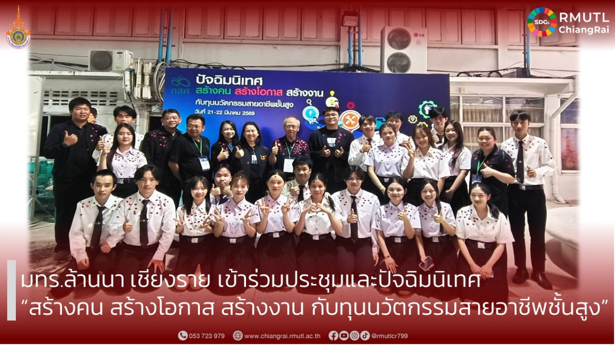 ระหว่างวันที่ 21 – 22 มีนาคม 2569 มหาวิทยาลัยเทคโนโลยีราชมงคลล้านนา เชียงราย นำโดยคณาจารย์ บุคลากร และนักศึกษา เข้าร่วมการประชุมปัจฉิมนิเทศภายใต้หัวข้อ “สร้างคน สร้างโอกาส สร้างงาน กับทุนนวัตกรรมสายอาชีพชั้นสูง” ณ วิทยาลัยอาชีวศึกษาเชียงราย อำเภอเมือง จังหวัดเชียงราย