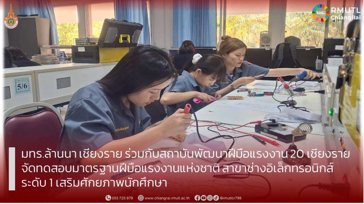 วันจันทร์ที่ 30 มีนาคม 2569 หลักสูตรวิศวกรรมอิเล็กทรอนิกส์และระบบควบคุมอัตโนมัติ มหาวิทยาลัยเทคโนโลยีราชมงคลล้านนา เชียงราย ร่วมกับสถาบันพัฒนาฝีมือแรงงาน 20 เชียงราย ดำเนินโครงการพัฒนาศักยภาพแรงงานเพื่อรองรับการจ่ายค่าจ้างตามมาตรฐานฝีมือแรงงาน โดยจัดการทดสอบมาตรฐานฝีมือแรงงานแห่งชาติ สาขาช่างอิเล็กทรอนิกส์ ระดับ 1 (ครั้งที่ 15/2569)