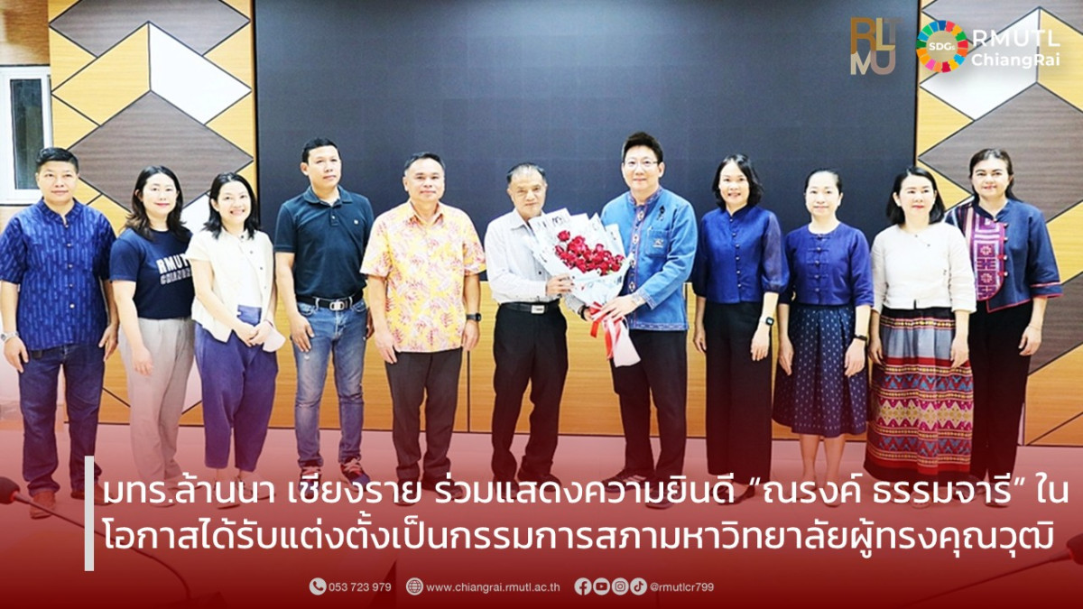 มหาวิทยาลัยเทคโนโลยีราชมงคลล้านนา เชียงราย นำโดย ผู้ช่วยศาสตราจารย์ ดร.อังกูร ว่องตระกูล ผู้อำนวยการสำนักงานบริหาร พร้อมด้วยคณะผู้บริหาร และคณาจารย์หลักสูตรการตลาดและการตลาดดิจิทัล ร่วมแสดงความยินดีกับ คุณณรงค์ ธรรมจารี ประธานบริษัท เอ็ม เอส พี อินเตอร์ ฟู้ดส์ จำกัด (หมูอินเตอร์ฯ) ในโอกาสได้รับพระบรมราชโองการโปรดเกล้าโปรดกระหม่อมแต่งตั้งให้ดำรงตำแหน่ง กรรมการสภามหาวิทยาลัยผู้ทรงคุณวุฒิ ของมหาวิทยาลัยเทคโนโลยีราชมงคลล้านนา ซึ่งมีผลตั้งแต่วันที่ 22 มีนาคม 2569 การได้รับแต่งตั้งในครั้งนี้นับเป็นเกียรติอย่างยิ่ง และสะท้อนถึงความรู้ ความสามารถ และประสบการณ์อันทรงคุณค่า ตลอดจนบทบาทสำคัญของภาคเอกชนในการมีส่วนร่วมพัฒนาการศึกษาในระดับอุดมศึกษา