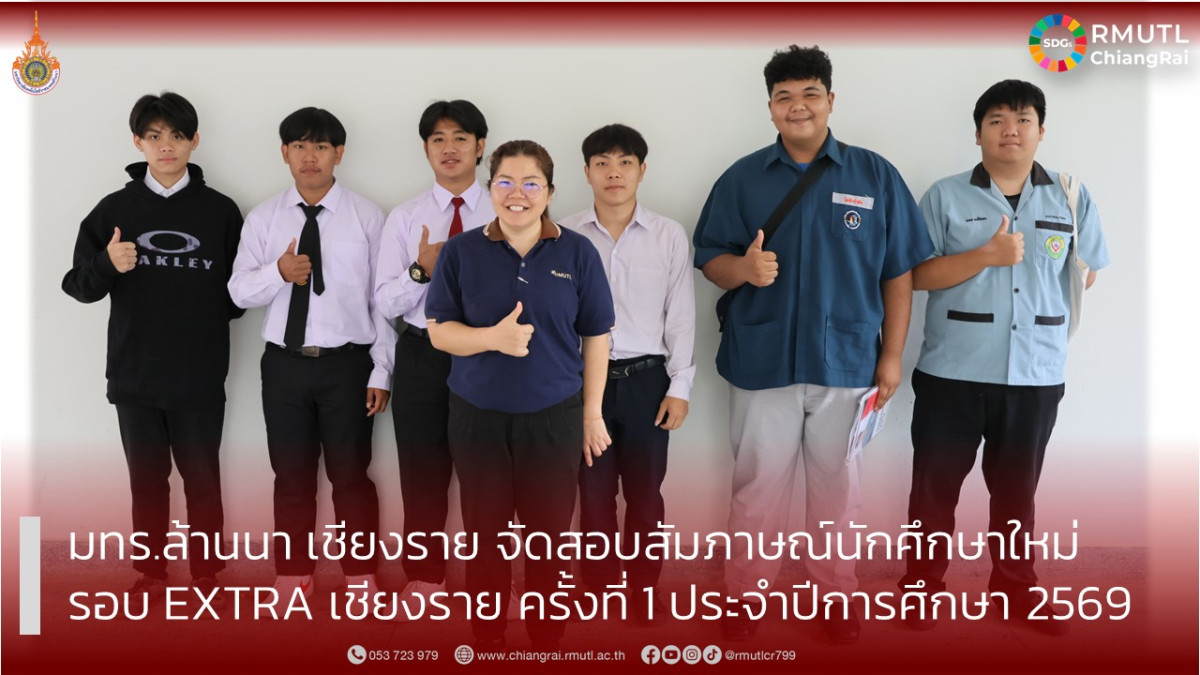 มหาวิทยาลัยเทคโนโลยีราชมงคลล้านนา เชียงราย เดินหน้าสร้างโอกาสทางการศึกษา เปิดเวทีต้อนรับผู้สมัครเข้าศึกษาต่อระดับประกาศนียบัตรวิชาชีพ (ปวช.) ประกาศนียบัตรวิชาชีพชั้นสูง (ปวส.) และระดับปริญญาตรี ในรอบ EXTRA เชียงราย ครั้งที่ 1 ประจำปีการศึกษา 2569 ซึ่งกระบวนการรับสมัครและการสอบคัดเลือกได้ดำเนินการเสร็จสิ้นเรียบร้อยแล้ว